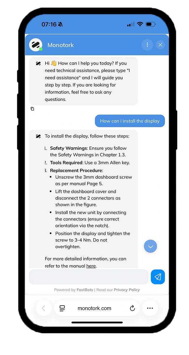 You can ask any question, from general information to step-by-step guidance for installing spare parts.